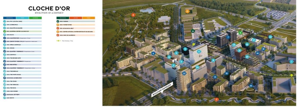 Le quartier de la Cloche d’Or est un véritable cadre de vie idéal pour les entreprises et les habitants, il a été conçu selon les principes du New Urban Living, une approche intégrée du développement urbain qui combine performance énergétique, mixité des usages et qualité de vie. Il bénéficie de la certification DGNB Platinum, l’une des plus exigeantes en matière d’urbanisme durable en Europe. La présence d’un grand parc urbain, d’un couloir écologique reliant les espaces naturels environnants, ainsi qu’un réseau de mobilité douce parfaitement cohérent font de la Cloche d’Or un quartier agréable à vivre et accessible à tous, tout en respectant l’environnement.